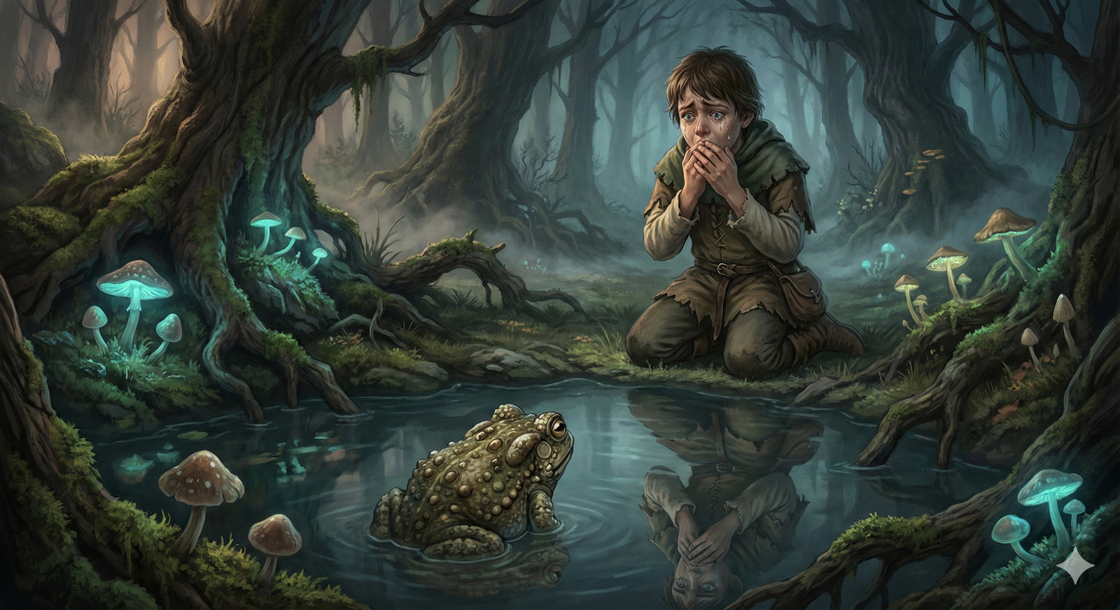 Сөйтіп ол бұлаққа келіп, судың бетіне көз салған сәтте, қорқыныштан төбе шашы тік тұрды. Ол өзінің бет-бейнесінің бақаға, ал денесінің жыланға ұқсап кеткенін байқады. Жалпақ сұрғылт бетті, жасыл көзді, денесі де дәл жыланның терісіндей жасыл-сұры болып кеткен екен.