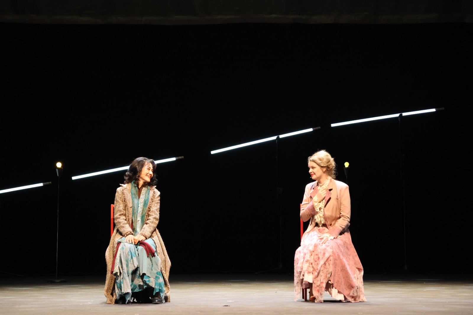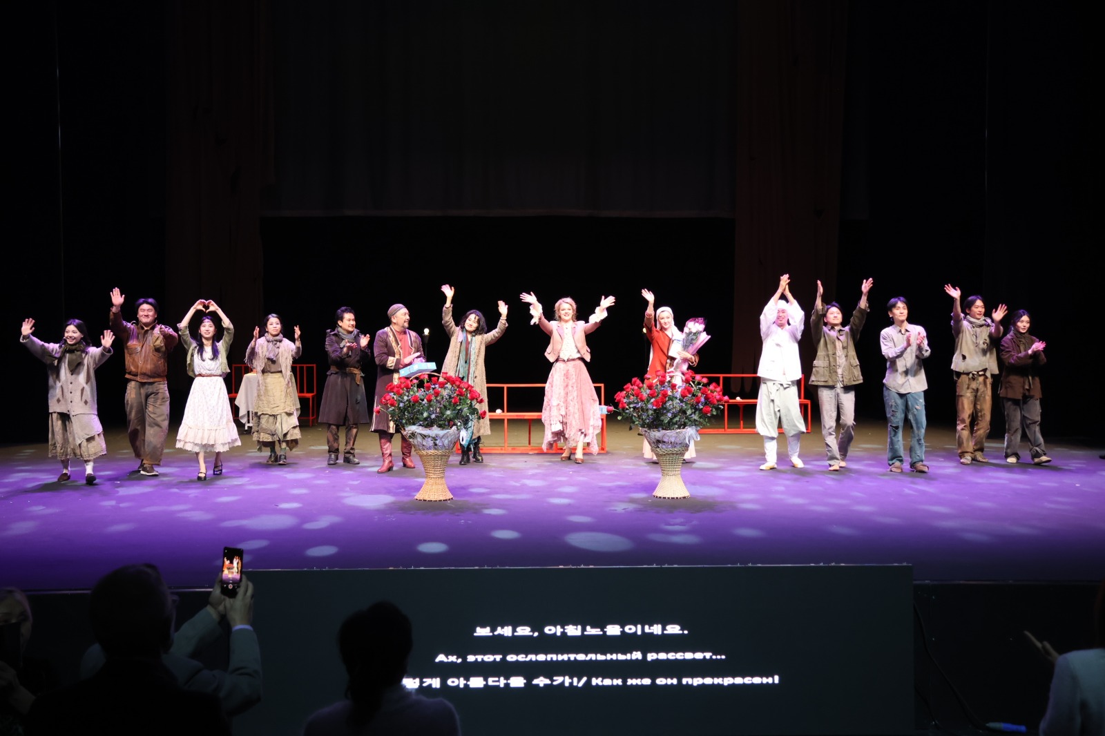 Қ.Қуанышбаев атындағы қазақ ұлттық музыкалық драма театры қойған жаңа премьера «Париждегі екі әйелге» бардық. Бірінші назарымызды аударғаны – спектакльді көруге келген көрермен арасында корей ұлтының адамдары көп болғандығы. Екінші ерекшелік – қойылым бастан аяқ дерлік корей тілінде жүріп жатты, ара арасында орыс тіліндегі монолог, диалогтарға түсініп алуға жақсы болды деп қуанып отырдық. Аударма болмады емес, болды, бірақ сахнаның төменгі жағында майда әріптермен жазылғандықтан, көрерменнің бірі оқи алды, бірі оқи алмағаны анық. Егер опера және балет театрындағыдай жазу жоғарыдан жүріп жатқан болса, бұл көрермен үшін ыңғайлы болар еді деп ойладық. Дегенмен, жалпы оқиға барысынан, өзімізге соншама жылы ұшыраған Раневскаяның әңгімесі арқылы біраз жайды түсіне алдық.