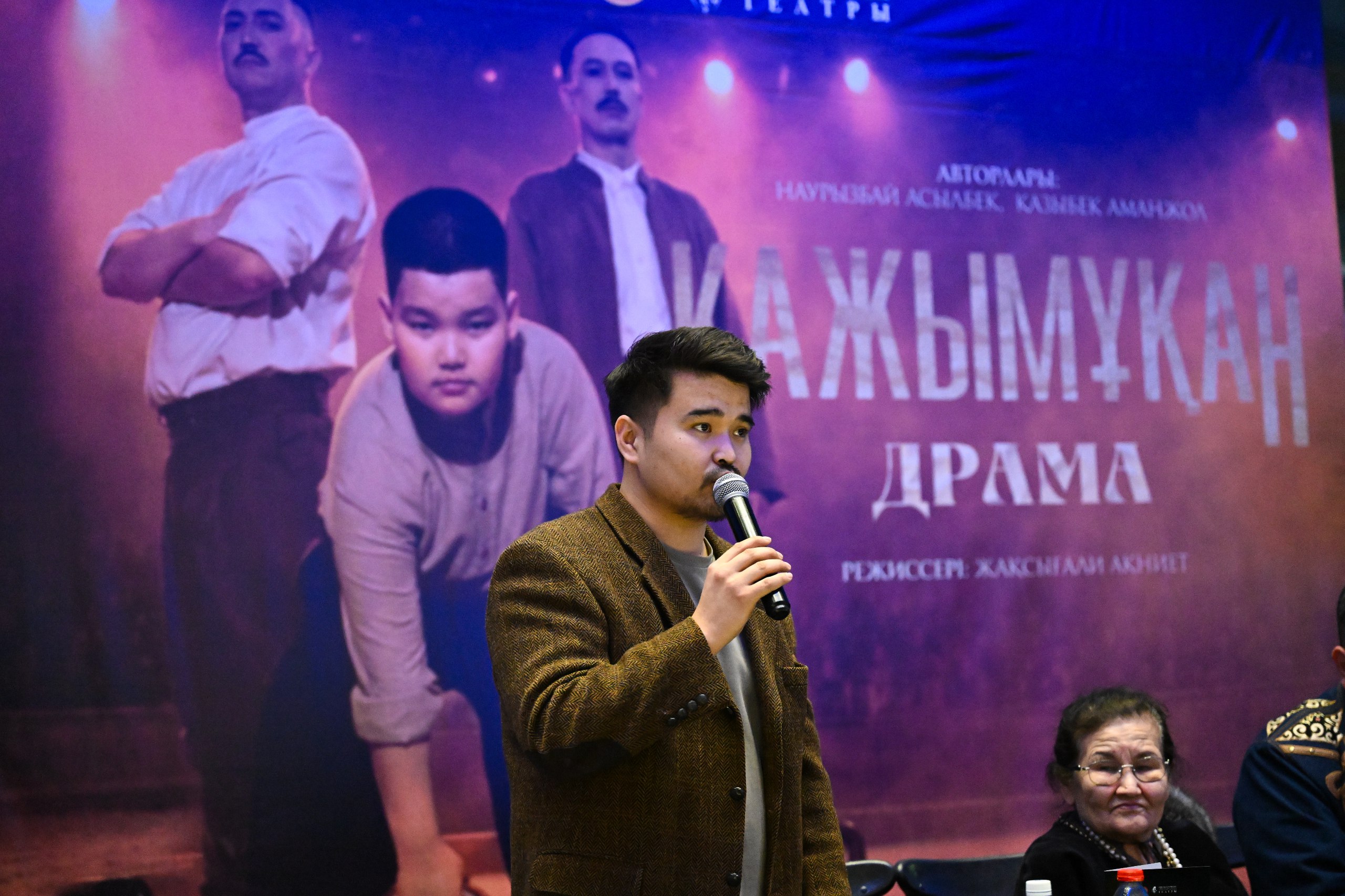 «Қажымұқан» драмасының авторы Наурызбай Асылбек: «Қайырлы кеш, құрметті театрсүйер қауым! «Тоқсан ауыздың тобықтай түйінін» айтатын болсақ, біз қандай қадам жасасақ та тарихты биік ұстауымыз керек. Себебі бізді ел қылатын да, бүтін қылатын да тарих. Бұған мен осы пьесаны жазған кезде анық көзім жетті. Келгендеріңізге көп рақмет!