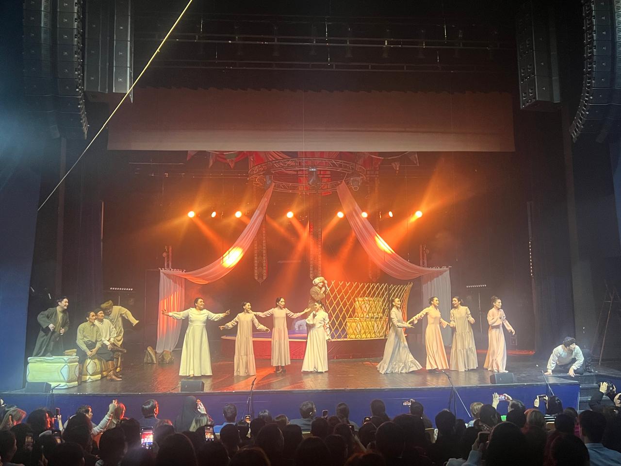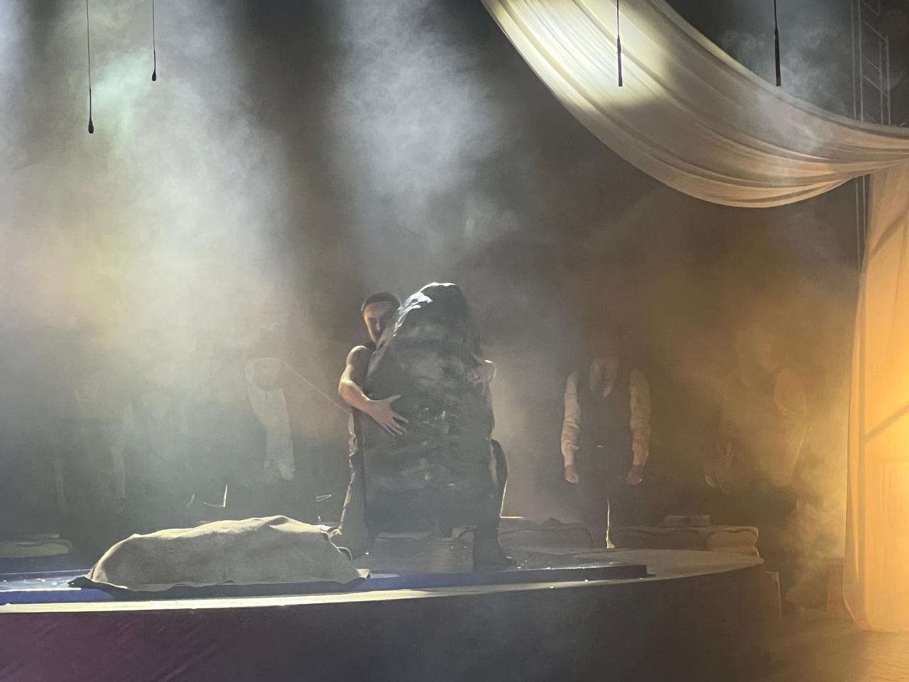 Бұдан соң сахналық қойылым басталды. Режиссердің көрермен залы мен сахнаны заманауи декоративті-көркемдік безендіру мүмкіндіктерін пайдалан отырып, біртұтас әрі үнемі динамикалы өзгерістерге толы мизансценаға айналдыра білгендігі айқын аңғарылды.