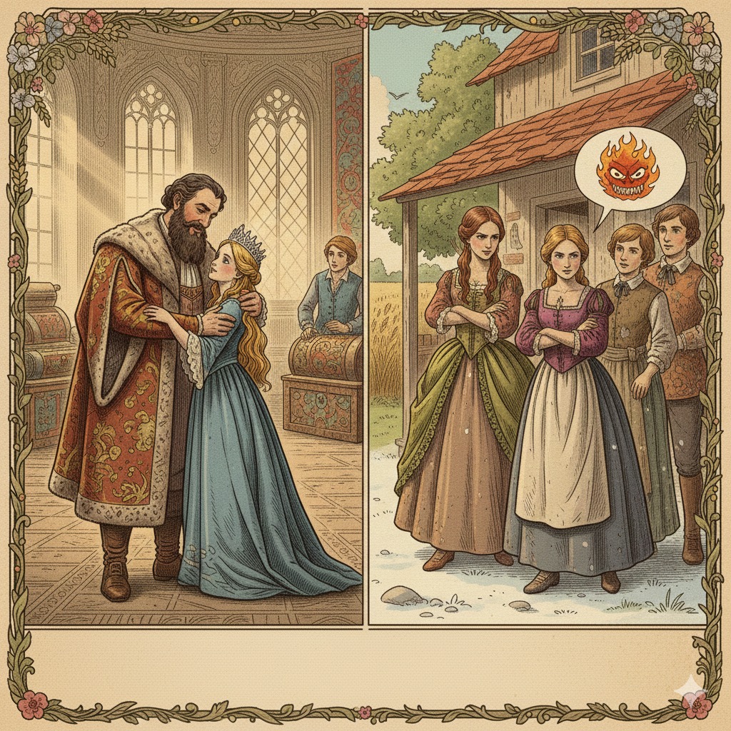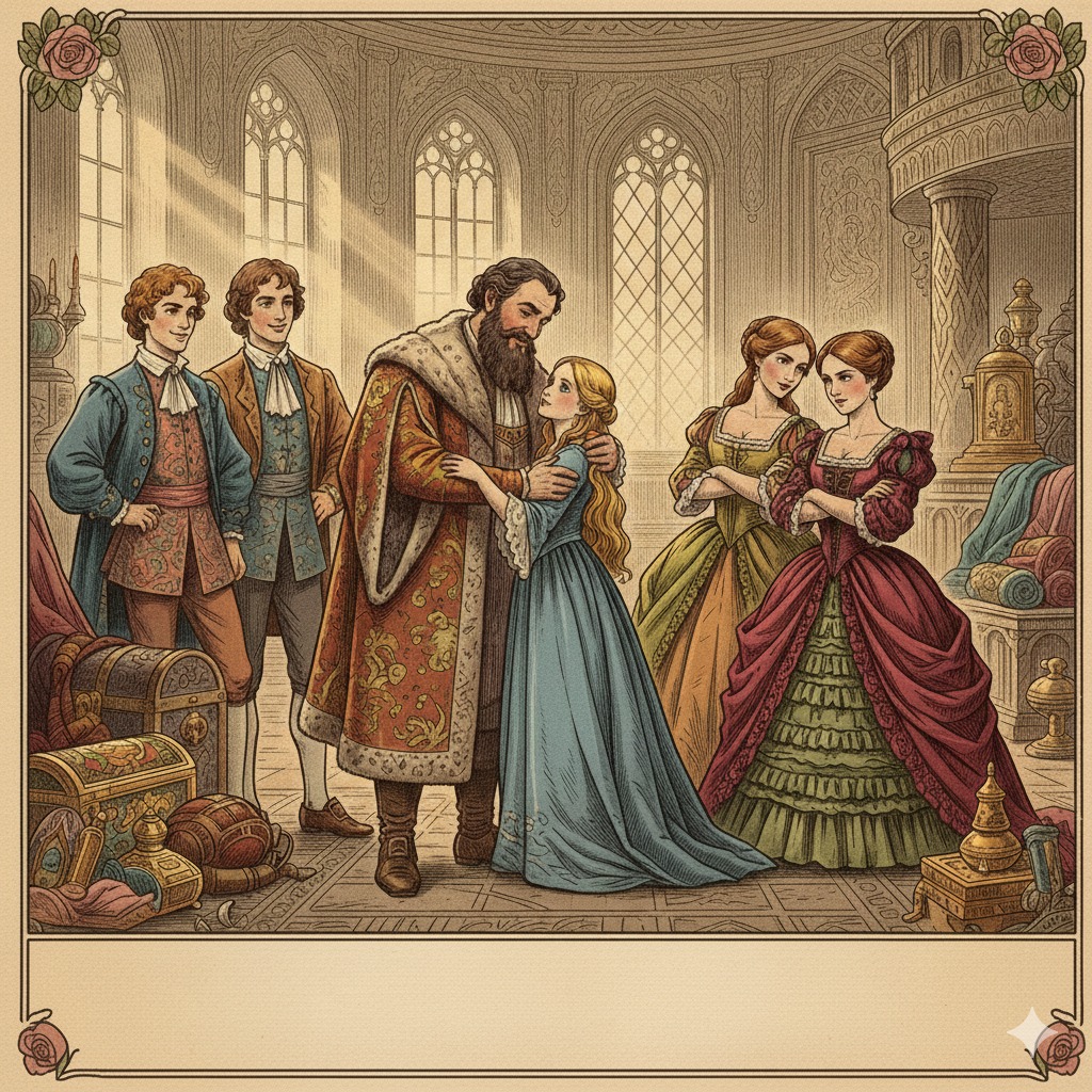 Айналасына қайырымдылығы, мейірімділігі үшін жұрттың бәрі бұл қызды жақсы көретін. Бірақ сол себепті әпкелері оны ұнатпайтын еді. Саудасы жүрмей, қарызға батқан көпес бір күні балаларын шақырып алып: