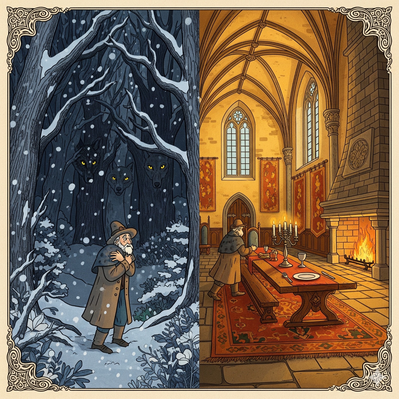 Кенет алыстан бір жылтыраған от көрінеді. Жүре-жүре жақындап келсе, ескі қамалдан шыққан жарық екен. Қамалдың қақпасын ашып ішіне кіріп, атын атқораға жайғастырып, залға өтті. Залда бір адамға арналған дастарқан жаюлы үстел бар екен. Камин маздап жанып тұр. Бірақ мұнда ешкім көрінбейді. «Мүмкін, қазір үй иесі келіп қалар», - деп ойлаған көпес оны бір сағат, екі сағат, үш сағат күтті – ешкім келген жоқ. Ақыры күте-күте жалыққан көпес дастарқанға отырып, асықпай тамақтануға кірісті.