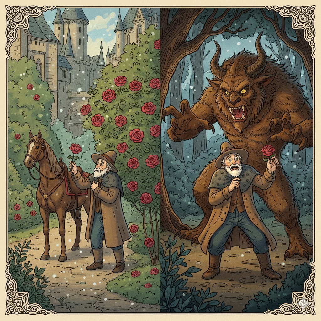 «Бұл өзі бір мезетте мейірімді әрі қатал болатын – қалай бір түрлі құбыжық еді?» - деп аң-таң болады көпес. Сөйтіп ол атына мініп алып, үйіне қарай беттеді. Аты үйге апаратын төте жолды тез-ақ тауып, көпес тіпті күн батардан бұрын жетіп үлгерді. Балаларын көріп көзайым болған соң, көпес кенже қызына раушан гүлін беріп тұрып: