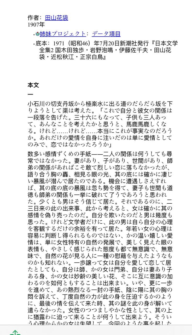 Осы сәтте Такэнака Мопассанның «Әке» деген әңгімесін, әсіресе жас қыздың еркекпен жақындасып пәктігінен айырылғаннан кейін қоймастан өксіп жылайтын жерін есіне алды. Сол көрініс жанына батып, жүрегін қайтадан сыздатқанда бойында жаңа ғана ойлаған арам ниетіне қарсы күш оянғандай болды. Оның жан азабы осылайша жалғаса берді, бір қасіретке толы ойларды екінші бір сондай ойлар алмастырып, бір қырынан екінші қырына дөңбекшумен таңды да атырды-ау.